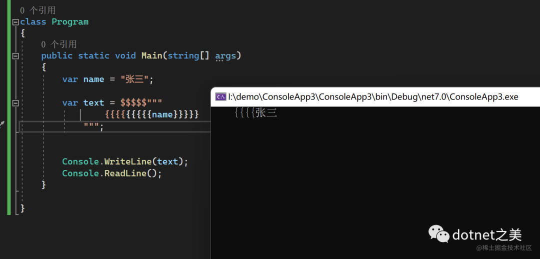$(可有多个)内插字符串一起使用,前缀$的数量是指示嵌套代码表达式所需的花括号的数量。如果原始字符串文字以$$为前缀,则将单个大括号视为内容,并且需要两个大括号来指示嵌套代码。就像使用引号一样,您可以添加更多$以允许将更多大括号视为内容。