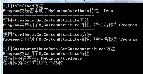 Console.WriteLine("Program类是否申明了MyCustomAttribute特性:{0}", isDefined);