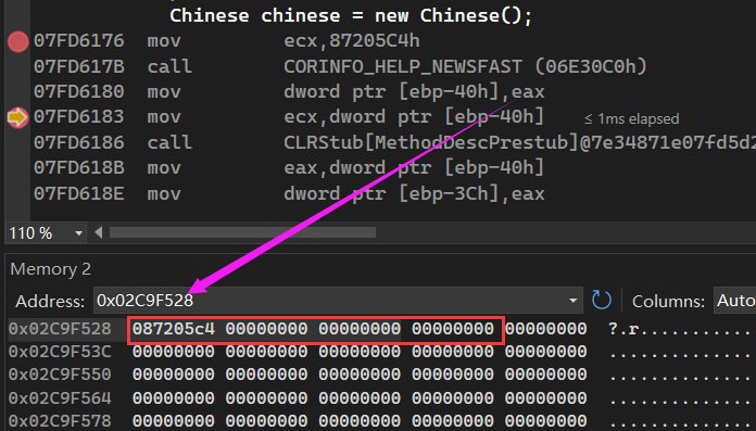 这里的 eax 是 CORINFO_HELP_NEWSFAST 初始化方法的返回值,可以在 ecx,dword ptr [ebp-40h] 处下一个断点,观察它的内存布局。