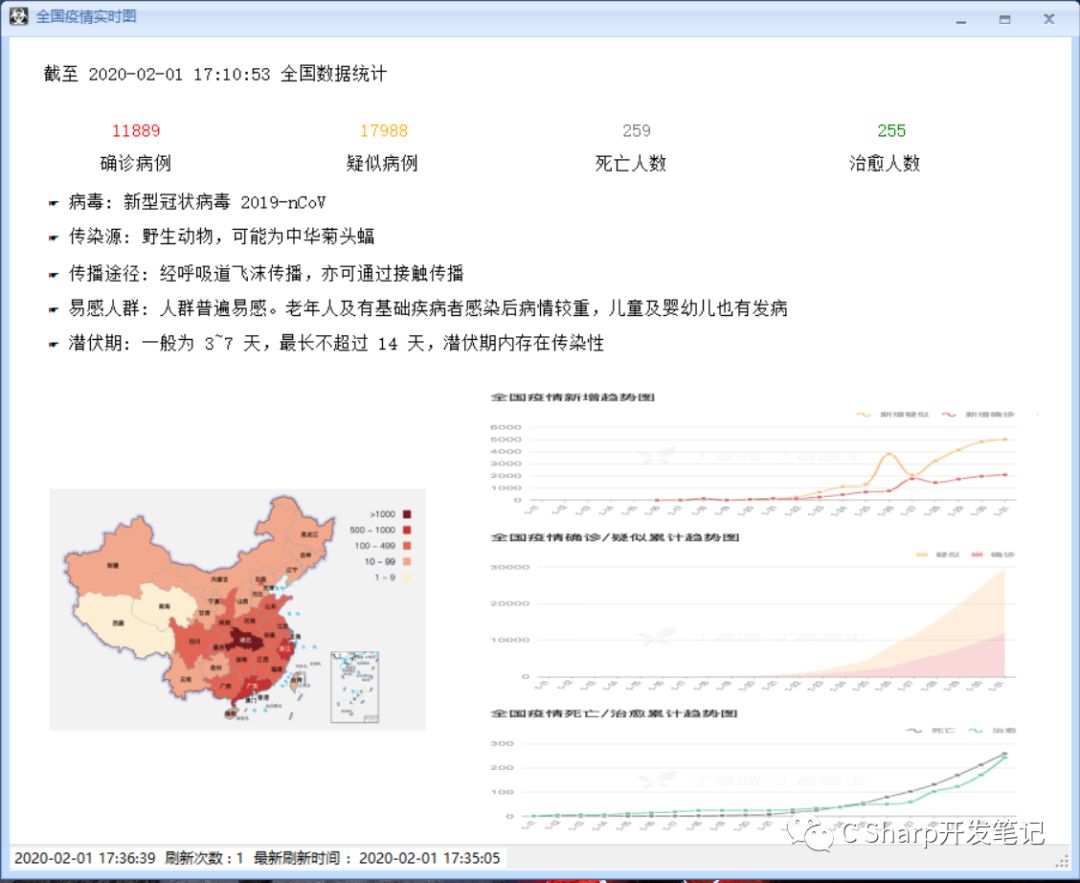 using System;using System.Drawing;using System.Text;using NSoup;using NSoup.Nodes;using System.IO;using System.Net;using System.Text.RegularExpressions;using System.Windows.Forms;namespace Pneumonia{public partial class MainForm : DevComponents.DotNetBar.OfficeForm{static string confirmedCount, suspectedCount, deadCount, curedCount, updateTime, dataUpdateTime;static string url = "https://3g.dxy.cn/newh5/view/pneumonia";static int count = 0;static Document doc;public MainForm(){this.EnableGlass = false;InitializeComponent();this.SizeChanged += new Resize(this).Form1_Resize; //窗口自适应代码}private void MainForm_Load(object sender, EventArgs e){timer1.Enabled = true;timer1.Interval = 1;timer1.Start();WebClient wc = new WebClient();byte[] htmlData = wc.DownloadData(url);string html = Encoding.UTF8.GetString(htmlData);logWrite(html);//将网页内容写入txt文件,以方便查看toolStripStatusLabel1.Text = DateTime.Now.ToString();}private void timer1_Tick(object sender, EventArgs e){dataUpdateTime = DateTime.Now.ToString();count++;timer1.Interval = 300000;GetData();lbl1.Text = "☛ 病毒: " + regularMatchStr("getStatisticsService", "virus\":\"(.+?)\",");lbl2.Text = "☛ 传染源: " + regularMatchStr("getStatisticsService", "infectSource\":\"(.+?)\",");lbl3.Text = "☛ 传播途径: " + regularMatchStr("getStatisticsService", "passWay\":\"(.+?)\",");lbl4.Text = "☛ " + regularMatchStr("getStatisticsService", "remark1\":\"(.+?)\",");lbl5.Text = "☛ " + regularMatchStr("getStatisticsService", "remark2\":\"(.+?)\",");Image map = UrlToImage("https://img1.dxycdn.com/2020/0201/450/3394153392393266839-135.png");pictureBox1.Image = map;Image chart = UrlToImage("https://img1.dxycdn.com/2020/0201/693/3394145745204021706-135.png");pictureBox2.Image = chart;updateTimeLbl.Text = "截至 " + updateTime + " 全国数据统计";confirmedLbl.Text = confirmedCount;suspectedLbl.Text = suspectedCount;deadLbl.Text = deadCount;curedLbl.Text = curedCount;}public static void GetData(){//直接通过url来获取Document对象doc = NSoupClient.Connect(url).Get();//先获取id为artContent的元素,再获取所有的p标签updateTime = ConvertStringToDateTime(regularMatchStr("getStatisticsService", "modifyTime\":(.+?),")).ToString();confirmedCount = regularMatchStr("getStatisticsService", "confirmedCount\":(.+?),");suspectedCount = regularMatchStr("getStatisticsService", "suspectedCount\":(.+?),");deadCount = regularMatchStr("getStatisticsService", "deadCount\":(.+?),");curedCount = regularMatchStr("getStatisticsService", "curedCount\":(.+?),");}#region 下载图片到Imagepublic static Image UrlToImage(string url){WebClient mywebclient = new WebClient();byte[] Bytes = mywebclient.DownloadData(url);using (MemoryStream ms = new MemoryStream(Bytes)){Image outputImg = Image.FromStream(ms);return outputImg;}}#endregionpublic static DateTime ConvertStringToDateTime(string timeStamp){DateTime dtStart = TimeZone.CurrentTimeZone.ToLocalTime(new DateTime(1970, 1, 1));long lTime = long.Parse(timeStamp + "0000");TimeSpan toNow = new TimeSpan(lTime);return dtStart.Add(toNow);}public static string regularMatchStr(string elementId, string regex){Element p = doc.GetElementById(elementId);Regex reg = new Regex(regex, RegexOptions.IgnoreCase);//例如我想提取line中的NAME值Match match = reg.Match(p.Html());string value = match.Groups[1].Value;return value;}public static void logWrite(string Message){if (!File.Exists(AppDomain.CurrentDomain.BaseDirectory + "\\log.txt"))File.Create(AppDomain.CurrentDomain.BaseDirectory + "\\log.txt").Close();string fileName = AppDomain.CurrentDomain.BaseDirectory + "\\log.txt";string content = DateTime.Now.ToLocalTime() + Message + "\r\n";StreamWriter sw = new StreamWriter(fileName, true);sw.Write(content);sw.Close(); sw.Dispose();}private void notifyIcon1_MouseDoubleClick(object sender, MouseEventArgs e){if (e.Button == MouseButtons.Left)//判断鼠标的按键{//点击时判断form是否显示,显示就隐藏,隐藏就显示if (this.WindowState == FormWindowState.Normal){this.WindowState = FormWindowState.Minimized;this.Hide();}else if (this.WindowState == FormWindowState.Minimized){this.Show();this.WindowState = FormWindowState.Normal;this.Activate();}}else if (e.Button == MouseButtons.Right){//右键退出事件if (MessageBox.Show("是否需要关闭程序?", "提示:", MessageBoxButtons.OKCancel, MessageBoxIcon.Exclamation) == DialogResult.OK)//出错提示{//关闭窗口DialogResult = DialogResult.No;Dispose();Close();}}}private void timer2_Tick(object sender, EventArgs e){toolStripStatusLabel1.Text = DateTime.Now.ToString() + " 刷新次数 : " + count + " 最新刷新时间 :" + dataUpdateTime;}private void MainForm_FormClosing(object sender, FormClosingEventArgs e){if (MessageBox.Show("是否确认退出程序?", "退出", MessageBoxButtons.OKCancel, MessageBoxIcon.Question) == DialogResult.OK){// 关闭所有的线程this.Dispose();this.Close();}else{e.Cancel = true;}}private void MainForm_SizeChanged(object sender, EventArgs e){//判断是否选择的是最小化按钮if (WindowState == FormWindowState.Minimized){//隐藏任务栏区图标this.ShowInTaskbar = false;//图标显示在托盘区notifyIcon1.Visible = true;}}private void 退出ToolStripMenuItem_Click(object sender, EventArgs e){if (MessageBox.Show("是否确认退出程序?", "退出", MessageBoxButtons.OKCancel, MessageBoxIcon.Question) == DialogResult.OK){// 关闭所有的线程this.Dispose();this.Close();}}private void 显示ToolStripMenuItem_Click(object sender, EventArgs e){WindowState = FormWindowState.Normal;}}}