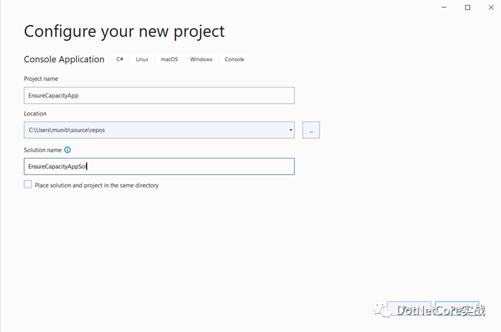我们将首先在 Visual Studio 2022 社区版中创建一个 C# 控制台应用程序,如下所示,