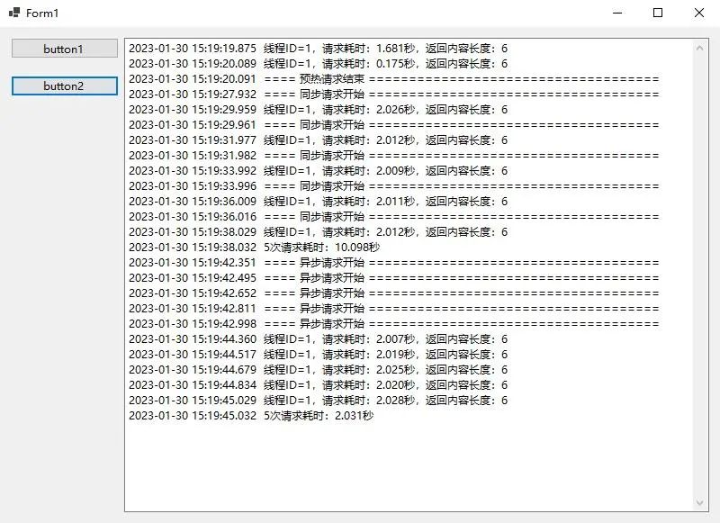 2、5次点击button1,共5次同步请求,每个请求耗时2秒,一共耗时10秒,嫌慢,想要并发请求?那你可能要使用Task.Run,在线程中调用同步方法,这又涉及到线程占用问题