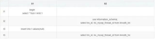 mysql> use information_schema;Reading table information for completion of table and column namesYou can turn off this feature to get a quicker startup with -ADatabase changedmysql> select trx_id, trx_mysql_thread_id from innodb_trx;+-----------------+---------------------+| trx_id | trx_mysql_thread_id |+-----------------+---------------------+| 421972504382792 | 70 |+-----------------+---------------------+1 row in set (0.00 sec)mysql> select trx_id, trx_mysql_thread_id from innodb_trx;+---------+---------------------+| trx_id | trx_mysql_thread_id |+---------+---------------------+| 1355623 | 70 |+---------+---------------------+1 row in set (0.01 sec)