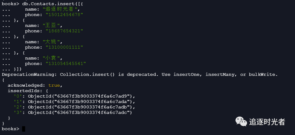 db.Contacts.insert([{name: "追逐时光者",phone: "15012454678"}, {name: "王亚",phone: "18687654321"}, {name: "大姚",phone: "13100001111"}, {name: "小袁",phone: "131054545541"}])