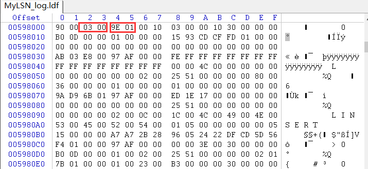 接下来用 WinHex 来定位 MyLSN_log.ldf 文件偏移 00598000 的位置,定位之前先将数据库离线。