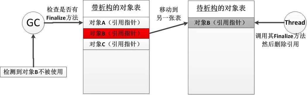 ② 当GC执行并且检测到一个不被使用的对象时,需要进一步检查“带析构方法的对象表”来查询该对象类型是否含有Finalize方法,如果没有则将该对象视为垃圾,如果存在则将该对象的引用移动到另外一张表,暂且称其为“待析构的对象表”,并且该对象实例仍然被视为在被使用。
