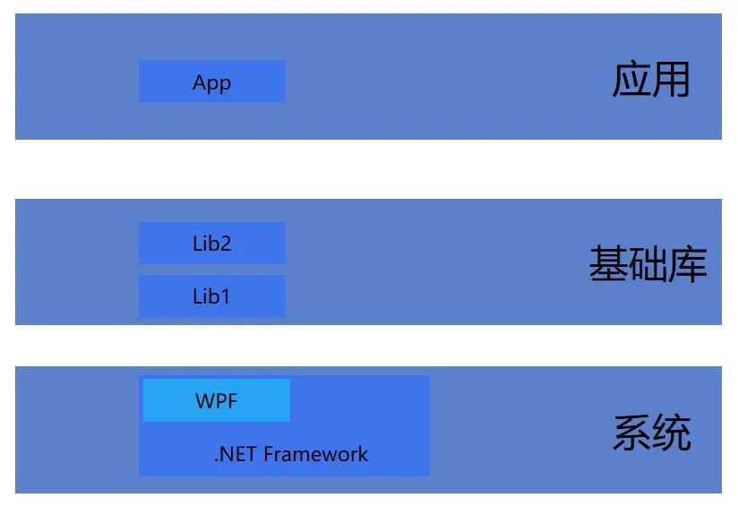 为了做到对 WPF 更多的定制化,我将 WPF 框架的地位从原先的应用运行时层,更改为基础库层,地位和 团队里面的基础组件 等 CBB 相同,只是作为底层库而存在,架构上和 最底层的基础库 平级