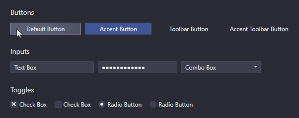 Adonis UI 带来了一个自定义窗口标题栏,默认情况下看起来与 Windows 10 标题栏一模一样,但有几个优点。首先,它尊重当前的配色方案,因此在切换到深色配色方案时它会变暗。其次,它的颜色也可以独立于颜色方案设置,例如通过绑定和触发器。第三,它的内容可以很容易地定制,例如通过隐藏图标、添加额外的按钮或在其中放置标签。派生您的窗口AdonisWindow以接收这些功能。