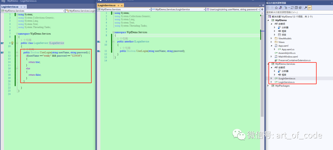 15、接下来试试依赖注入的使用。先创建一个WPF类库项目,提供一个LoginService类与接口当做服务;并提供UserLogin方法的实现,如下图所示。