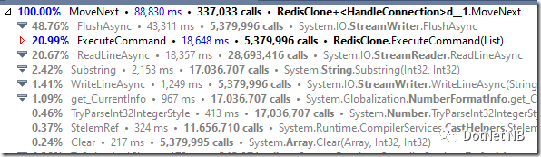 如果我们将其与第一次分析结果进行比较,我们可以发现一些非常有趣的数字。以前,我们为每个命令调用FlushAsync(请参阅ExecuteCommand&FlushAsync),现在我们更少调用它了。