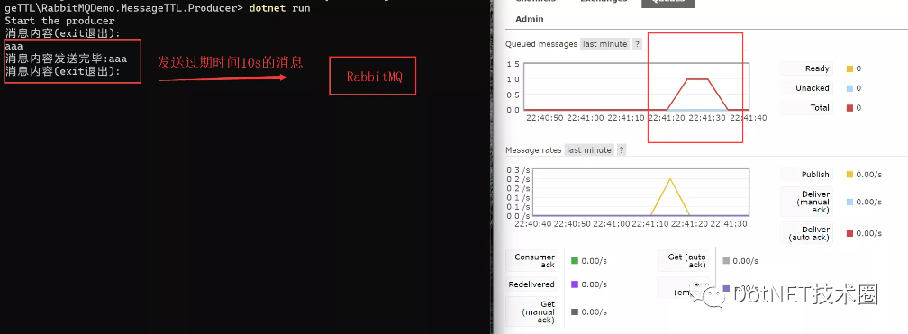 当ttl设置为0时,仅当消息能够立即被消费,否则消息立马过期,Web面板中只能见到消息发送,队列中没有消息,都被立马过期了。