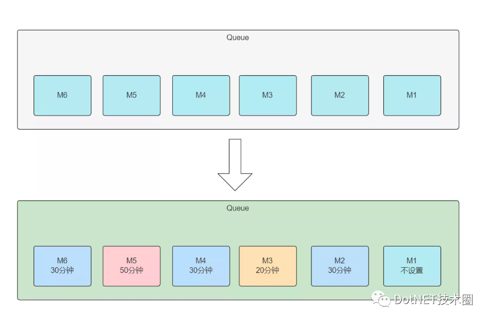 而为直接为消息设置过期时间时,各个消息的过期时间不尽相同,扫描时得队列全局扫描才能识别哪些消息是过期的。