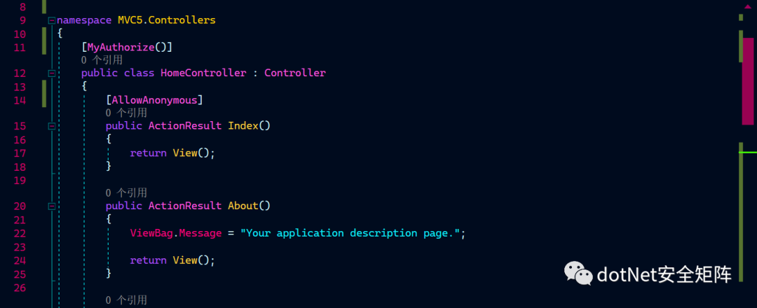 MVC提供了AllowAnonymousAttribute表示在授权期间跳过AuthorizeAttribute的控制器和操作,具体审计时关注Controller或者Action上方是否有[AllowAnonymous],有的话表示当前控制器或方法可以被匿名用户访问,也就是我们常见的未授权访问漏洞,如下代码