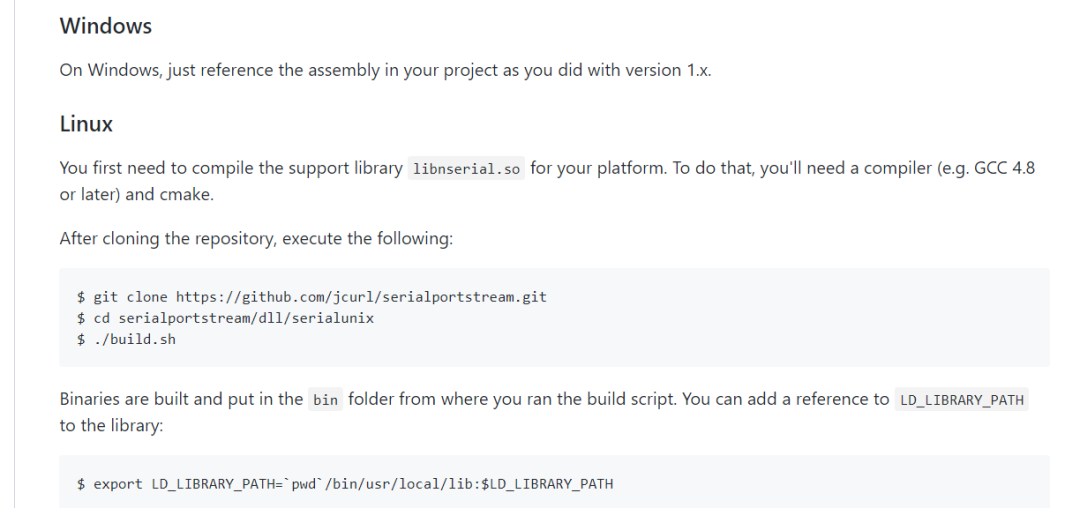 SerialPortStream 在 Windows 下可以正常使用,但是,在 Linux 系统下,必须为 Linux 平台编译支持库编译类库,其类库作者说明如下: