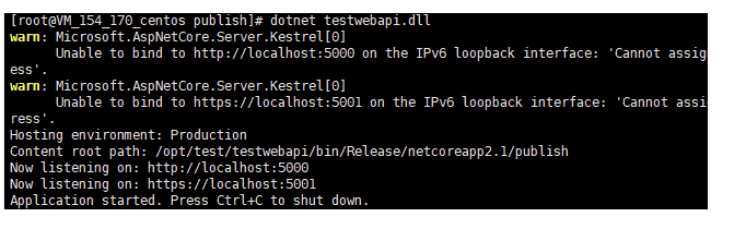 # 创建项目 dotnet new webapi --no-https -o testwebapi # 发布项目 cd testwebapi/ dotnet publish -c release cd bin/release/netcoreapp2.1/publish # 运行项目 dotnet testwebapi.dll