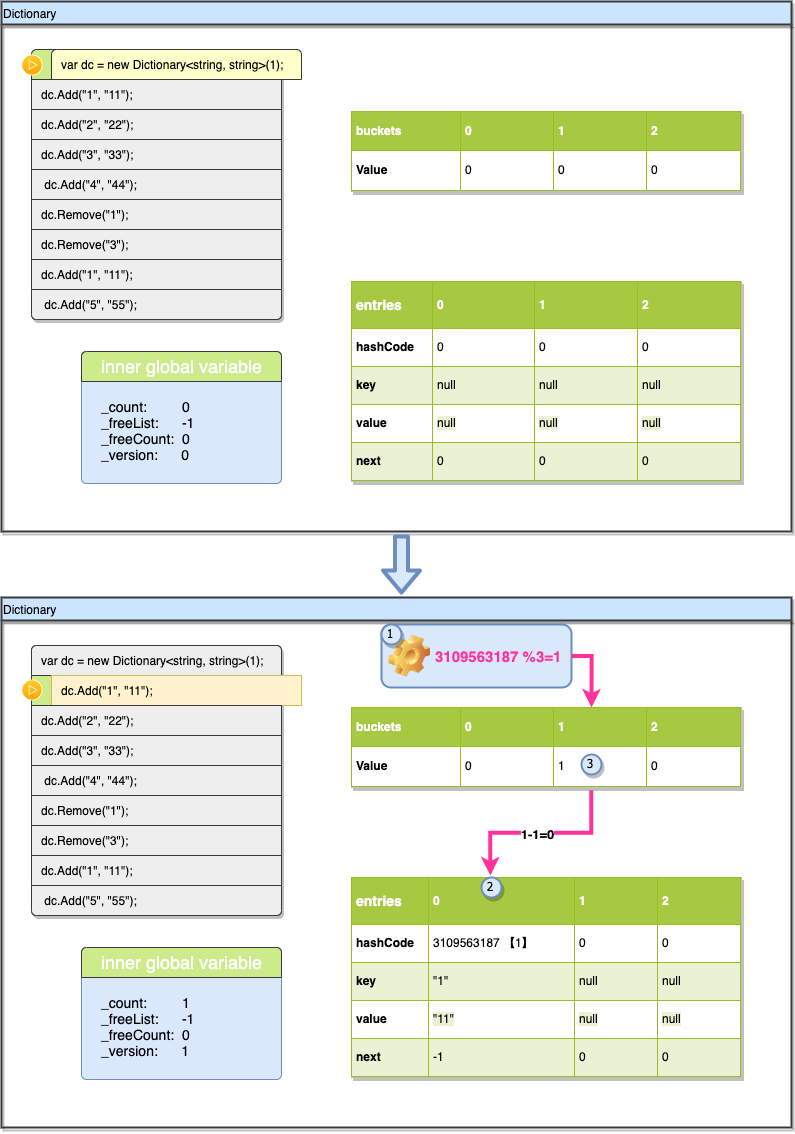 通过上文我们已经知道dictionary是如何通过buckets与entries维护数据的,但无论如何2个数组之间的关系的确有些绕,要完全搞清楚里面的逻辑最好还是有实际的数据实例,接下来我们通过一个简单的例子来看下buckets,entries里的内容是如何变化的。(实例代码代码会触发新增,删除,扩容,碰撞及对空槽位的重复利用等关键步骤)