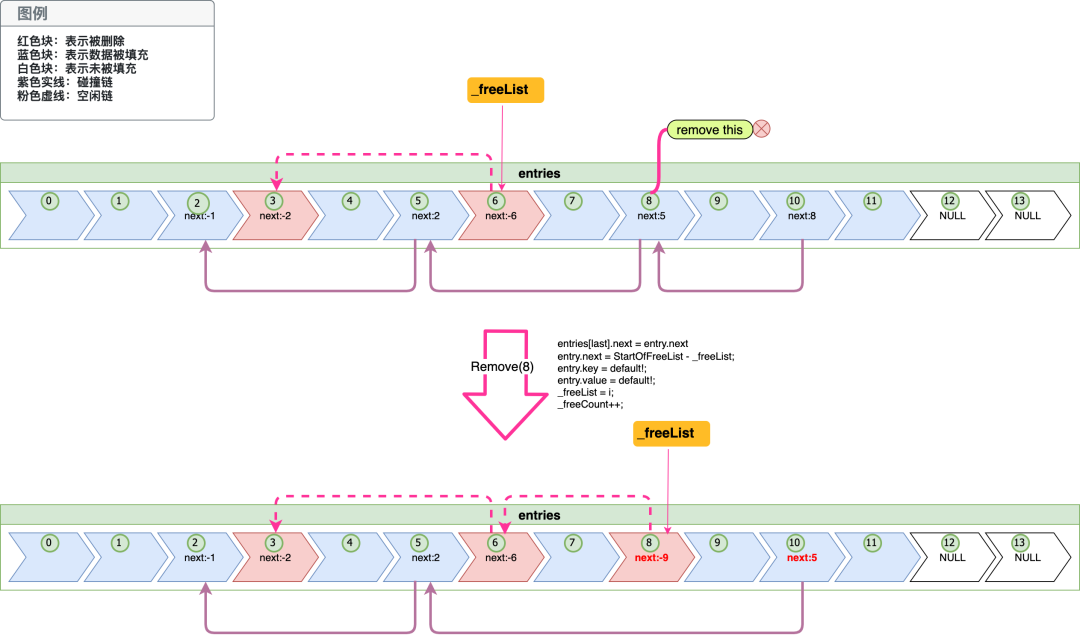 上图简单的表述了一次删除中next在碰撞链及空闲链中的变化(上图省略了buckets的变化),上图entries上方的粉红虚线为空闲链,下方紫色实线为一条碰撞链(注意在entries中空闲链只会有一条,而碰撞链会有很多,上图只画了一条)。在「图-删除元素」我们称上面删除发生前的entries为状态1,下面删除后的为状态2。