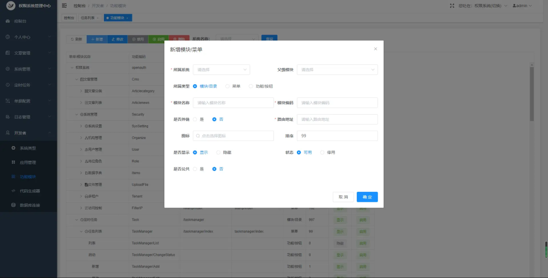 6、功能模块:配置系统菜单,操作权限,按钮权限标识等。