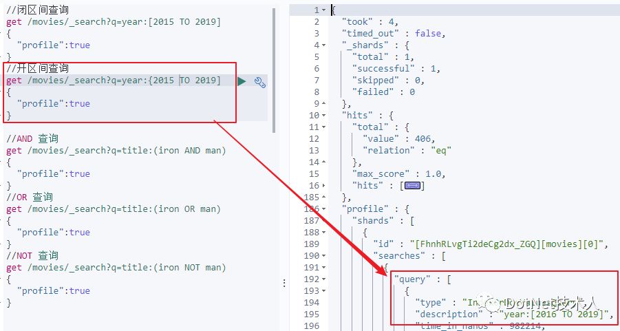 在OR查询中,我们会发现与Term查询结果是相同的,包括profile中所列出的description都是一样的。不相同的是查询类型,Term查询是TermQuery,Or查询是BooleanQuery。