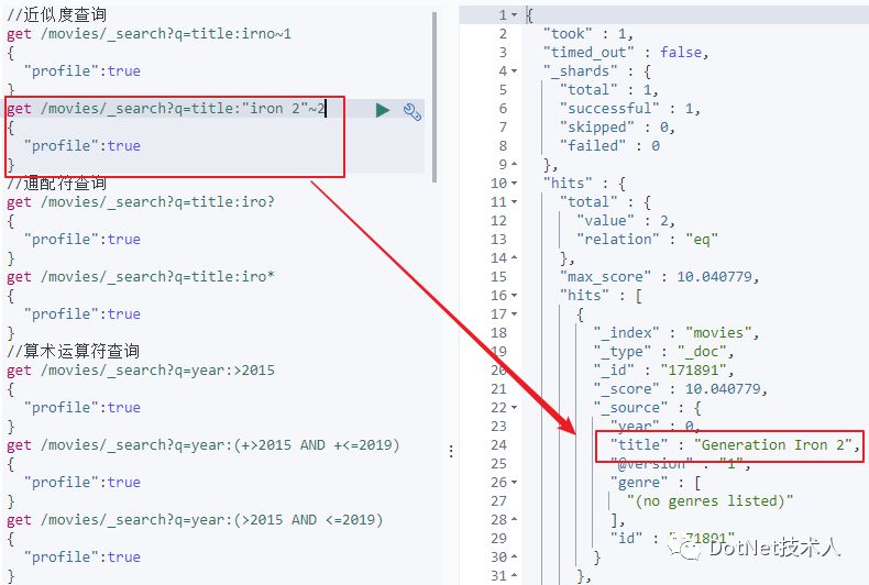 从上面两图中可以看出,近似度查询中的~1表示一个词中允许有一个字母与正确单词不差别;~2表示对一个短语进行搜索,可以搜索到缺失1个或2个词的短语,2个以上的不属于此搜索范围。