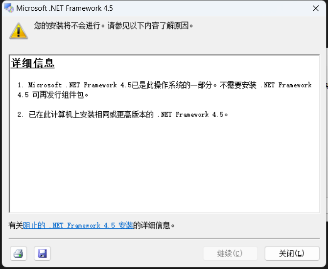 那么去官网下载.Net 4.5呢?很抱歉,安装时提示 :已在此计算机上安装相同或更高版本的.NET Framework4.5。如下图