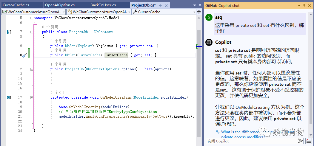 这里 AI 的回复是非常准确的,详细解释了set和private set的访问级别和用途。对于初学者,这无疑是非常有用的,他可以帮助你不断提高编程水平。