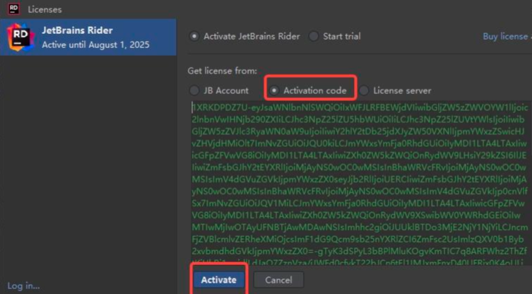 4)使用文件和输入key:首先解压文件,执行scripts/install-all-users.vbs 或者 scripts/install-current-user.vbs,然后等待即可,等弹出Done的窗口后(需要一会儿),就算成功了。然后打开Rider,在如下界面输入激活码: