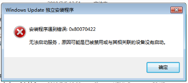 先到微软官方下载补丁 KB2533623,然后进行安装,安装过程中可能会出现“安装程序遇到错误:0x80070422 无法启动服务,原因可能是已被禁用或与相关联的设备没有启动。” 如图(2)的错误。